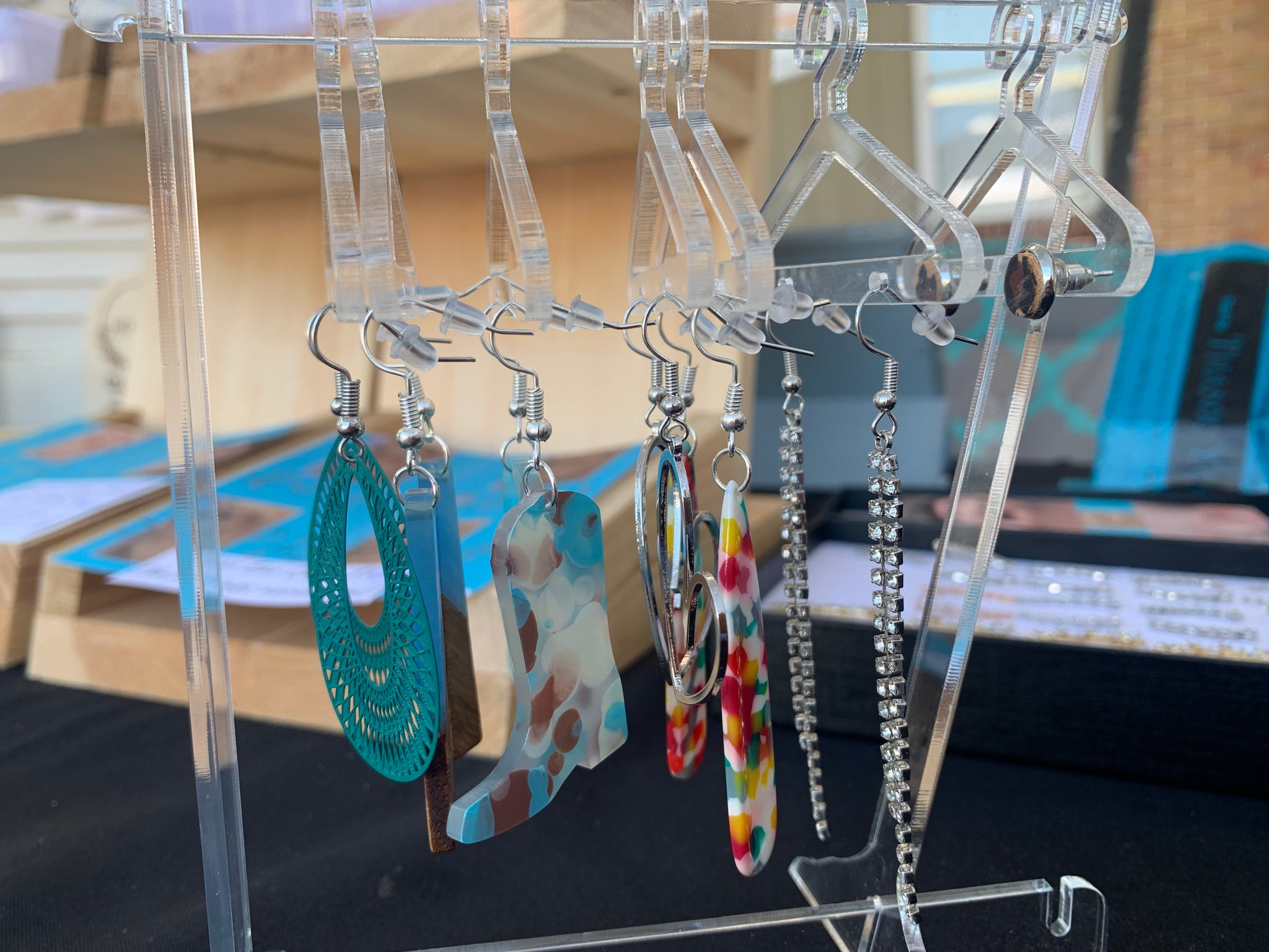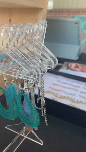 This adorable display features your favorite earrings on clothes hangers which hook directly onto the acrylic bar stand.